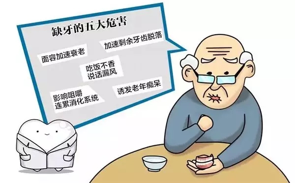 5.牙齿缺失影响全身健康 :牙齿缺失使食物在口腔内不能充分被嚼烂,阻碍营养物质的消化吸收,加重消化系统负担,影响老年人的全身健康。